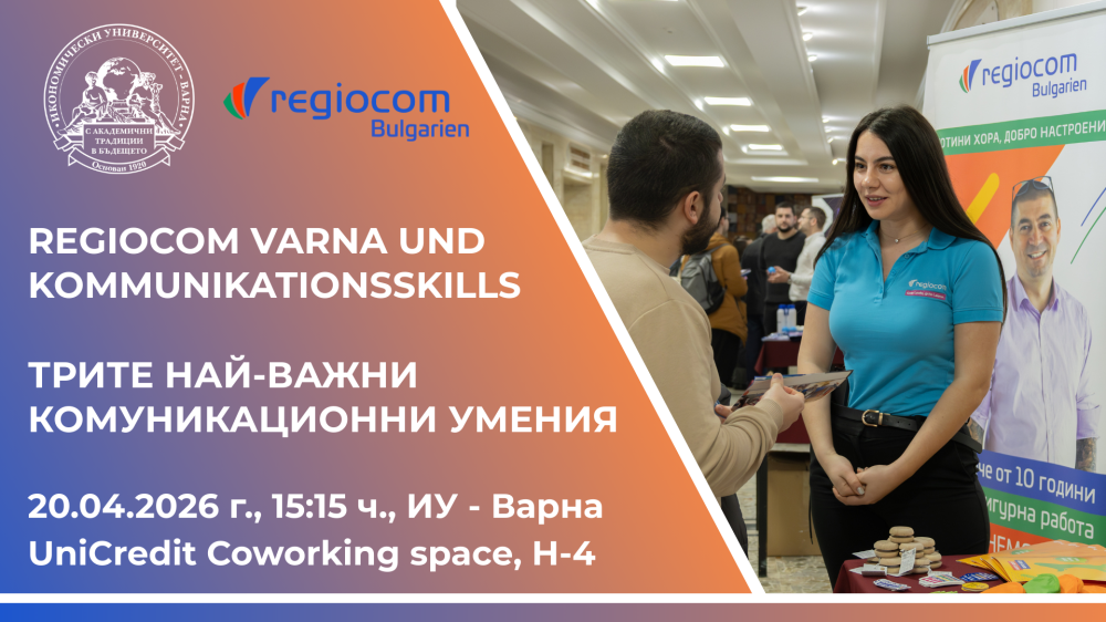 Колеж по туризъм - Варна2026-04-17T11:23:43+03:00На 20 април 2026 г. от 15:15 ч. в споделеното пространство на УниКредит Булбанк в Икономически университет – Варна ще се проведе специално събитие, насочено към студенти с интерес към работа в международна среда и чуждоезикови умения на немски език. Инициативата се организира съвместно с Regiocom Варна и ще протече в два основни модула. В първата част участниците ще имат възможност да се запознаят с дейността на компанията, както и с възможностите за работа и развитие, които тя предлага. Втората част на събитието ще бъде практически насочена и ще включва обучение на немски език на тема „Трите най-важни комуникационни умения“. Обучението ще бъде [...]